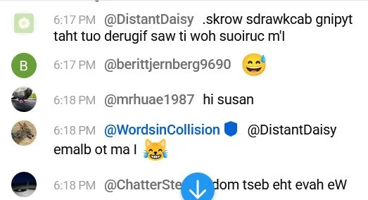 Using sites like Textreverse.com (yes, there is such a site, do not ask me why) helped us craft longer comments and un-backwardsed posted ones. To paraphrase Prof Malcolm, "Chat, uh, finds a way".