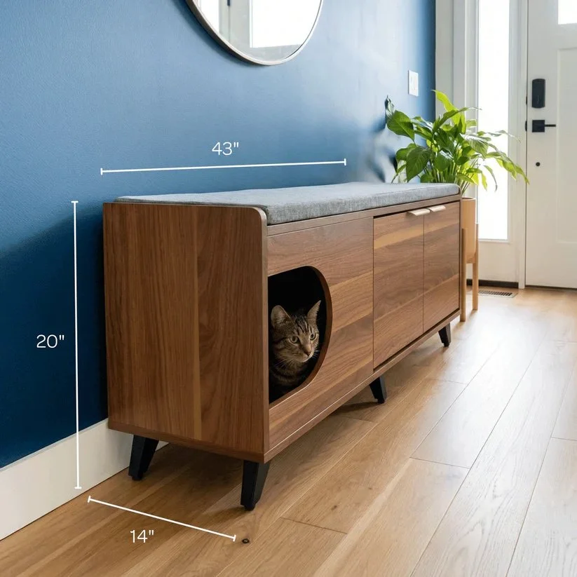 The Tucker Multifunction Shoe Storage Cabinet and Cat Condo Lounge is constructed from furniture-grade wood composite with an attractive laminate finish in your choice of Walnut or Oak. It features soft, cat-safe interior materials, and durable metal hardware for smooth drawer function.