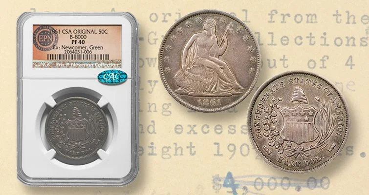 An 1861 Confederate half dollar (one of only four minted) from the legendary Eric P. Newman Collection sold for $960,000 and set a record for a Confederate half dollar at auction