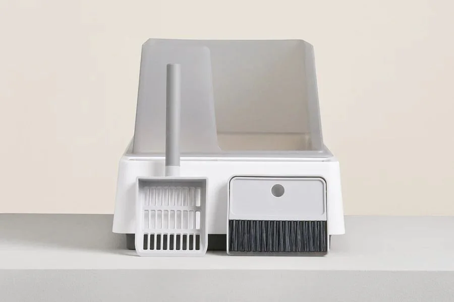 The Cove Litter Box is a compact, all-in-one litter box made from sturdy, durable, double-walled plastic and features a non-slip rubber base. The matte-finished plastic is smooth to the touch, making it both easy to clean and easy on the eyes. Speaking of cleaning, the box includes an integrated tool insert with a scoop, cleaning brush, and dustpan.